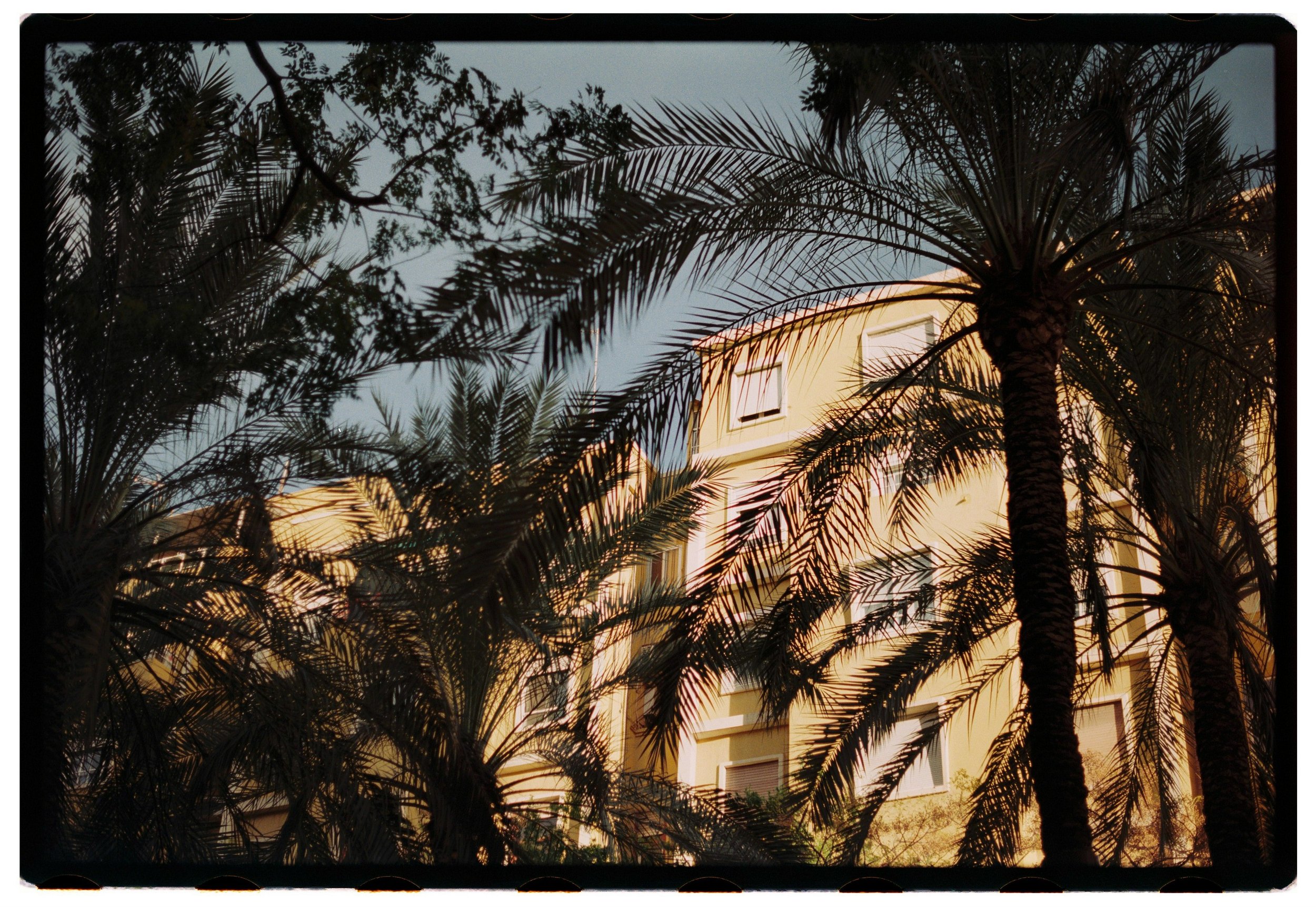 The last negatives glow with Mediterranean apartments filtered through palm leaves and trees heavy with bright yellow foliage, shadows cutting geometric shapes across warm stucco and blue sky.