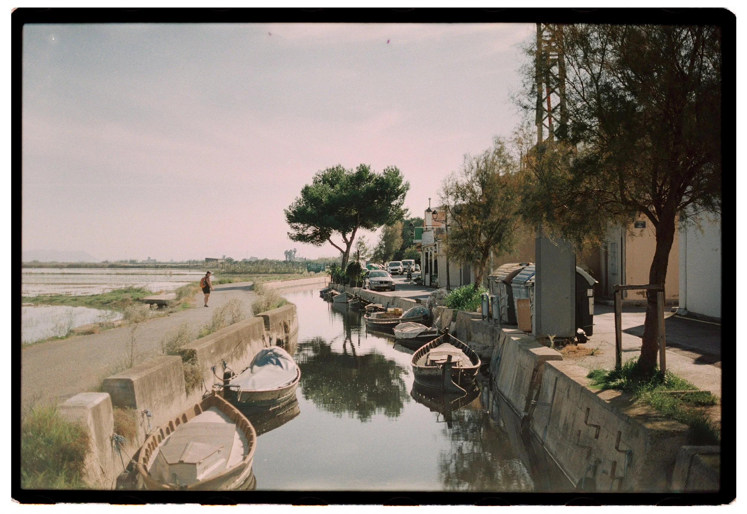 In the first frame, small wooden boats rest against a narrow canal, concrete walls guiding the water while a lone figure walks the path beside the marshes. The scene holds that quiet tension between movement and stillness: cars stacked on a tight village street on one side, open fields swallowing the horizon on the other.