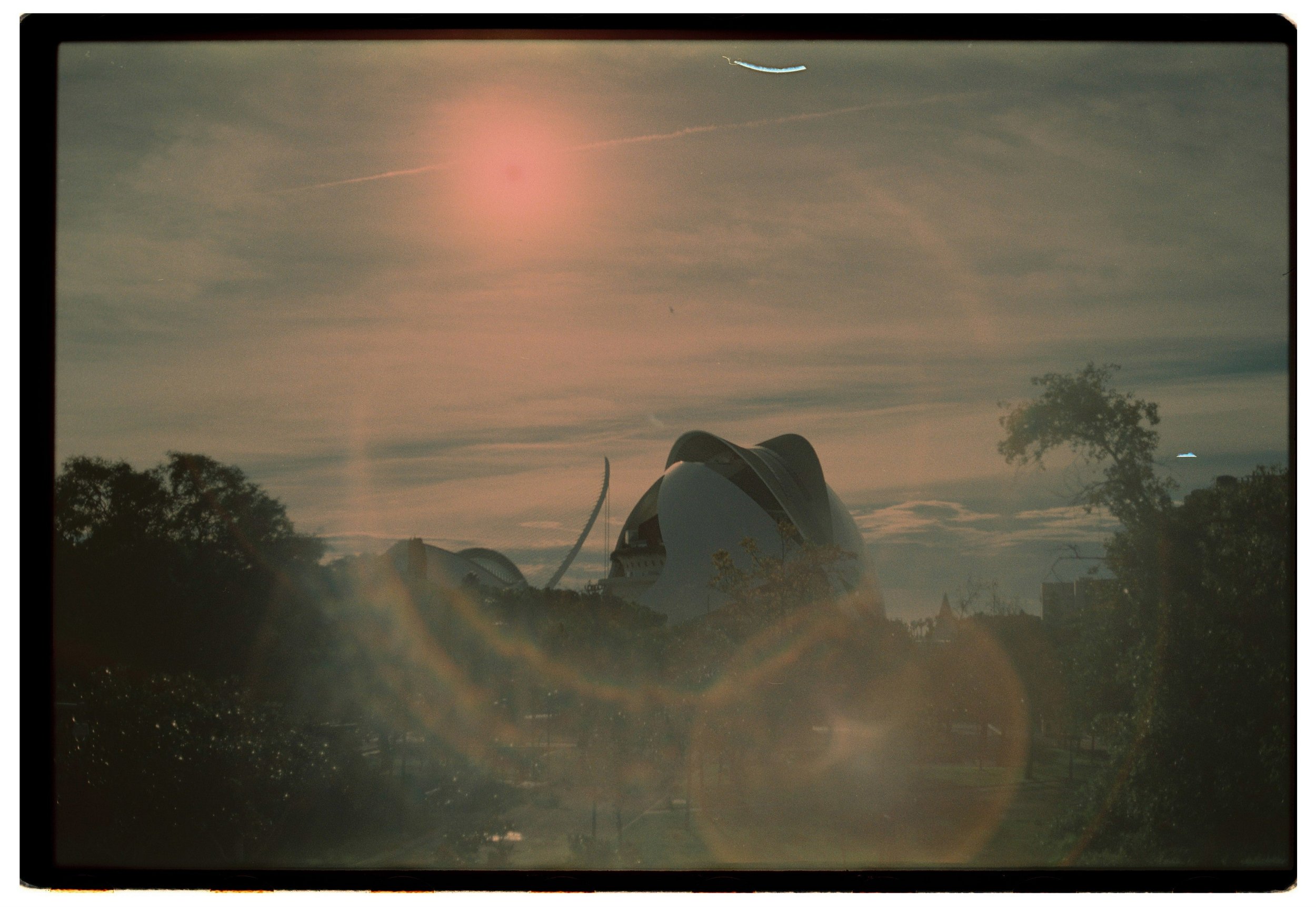 Another image catches an ultramodern white building rising from the skyline, wrapped in sunset haze and concentric circles of lens flare, as if the sky itself were double‑exposing the moment.